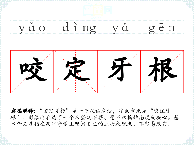 “咬定牙根”是一个汉语成语,字面意思是“咬住牙根”,形象地表达了一个人坚定不移、毫不动摇的态度或决心。基本含义是指在某种事情上坚持自己的立场或观点,不容易改变。