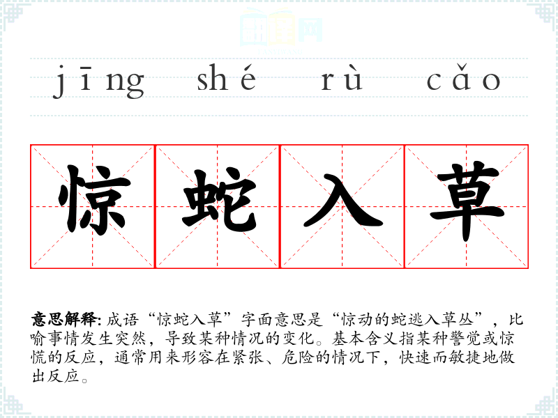 成语“惊蛇入草”字面意思是“惊动的蛇逃入草丛”,比喻事情发生突然,导致某种情况的变化。基本含义指某种警觉或惊慌的反应,通常用来形容在紧张、危险的情况下,快速而敏捷地做出反应。
