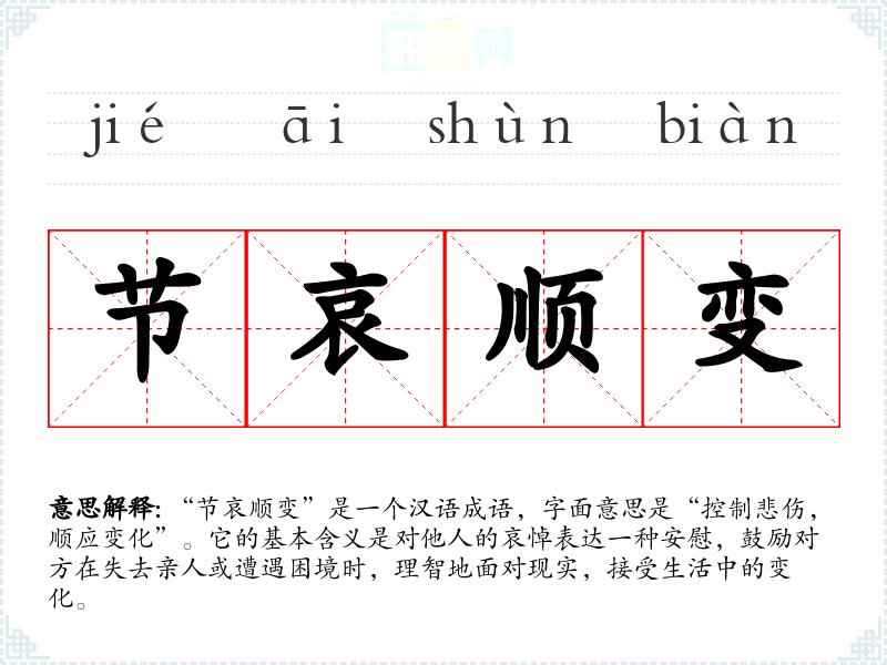 “节哀顺变”是一个汉语成语,字面意思是“控制悲伤,顺应变化”。它的基本含义是对他人的哀悼表达一种安慰,鼓励对方在失去亲人或遭遇困境时,理智地面对现实,接受生活中的变化。