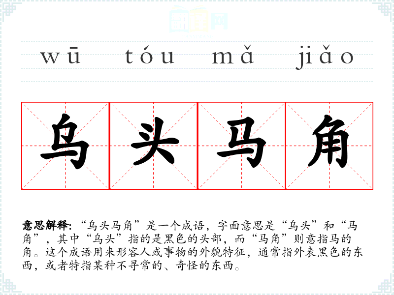 “乌头马角”是一个成语,字面意思是“乌头”和“马角”,其中“乌头”指的是黑色的头部,而“马角”则意指马的角。这个成语用来形容人或事物的外貌特征,通常指外表黑色的东西,或者特指某种不寻常的、奇怪的东西。
