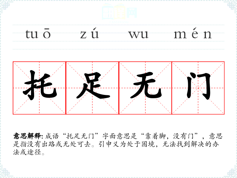成语“托足无门”字面意思是“靠着脚,没有门”,意思是指没有出路或无处可去。引申义为处于困境,无法找到解决的办法或途径。