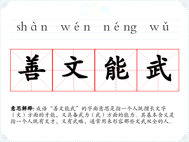 成语“善文能武”的字面意思是指一个人既擅长文字(文)方面的才能,又具备武力(武)方面的能力。其基本含义是指一个人既有文才,又有武略,通常用来形容那些文武双全的人。