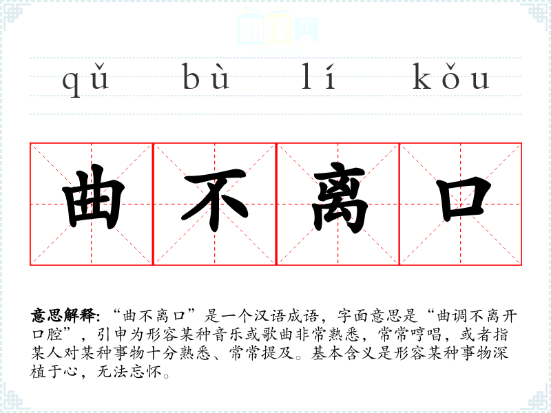 “曲不离口”是一个汉语成语,字面意思是“曲调不离开口腔”,引申为形容某种音乐或歌曲非常熟悉,常常哼唱,或者指某人对某种事物十分熟悉、常常提及。基本含义是形容某种事物深植于心,无法忘怀。