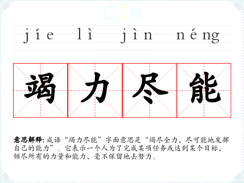 成语“竭力尽能”字面意思是“竭尽全力,尽可能地发挥自己的能力”。它表示一个人为了完成某项任务或达到某个目标,倾尽所有的力量和能力,毫不保留地去努力。