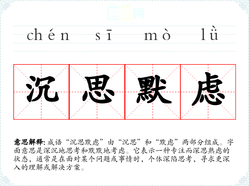 成语“沉思默虑”由“沉思”和“默虑”两部分组成。字面意思是深沉地思考和默默地考虑。它表示一种专注而深思熟虑的状态,通常是在面对某个问题或事情时,个体深陷思考,寻求更深入的理解或解决方案。