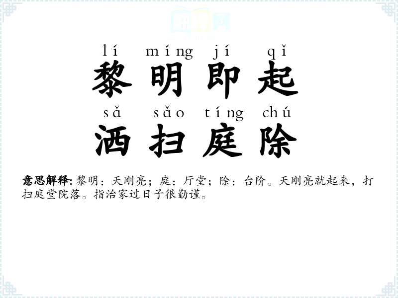 黎明:天刚亮;庭:厅堂;除:台阶。天刚亮就起来,打扫庭堂院落。指治家过日子很勤谨。 |