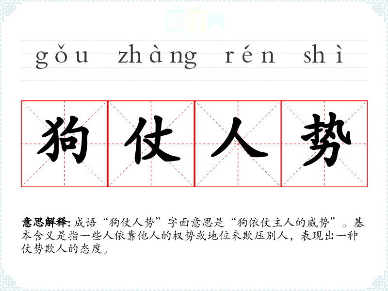 成语“狗仗人势”字面意思是“狗依仗主人的威势”。基本含义是指一些人依靠他人的权势或地位来欺压别人,表现出一种仗势欺人的态度。