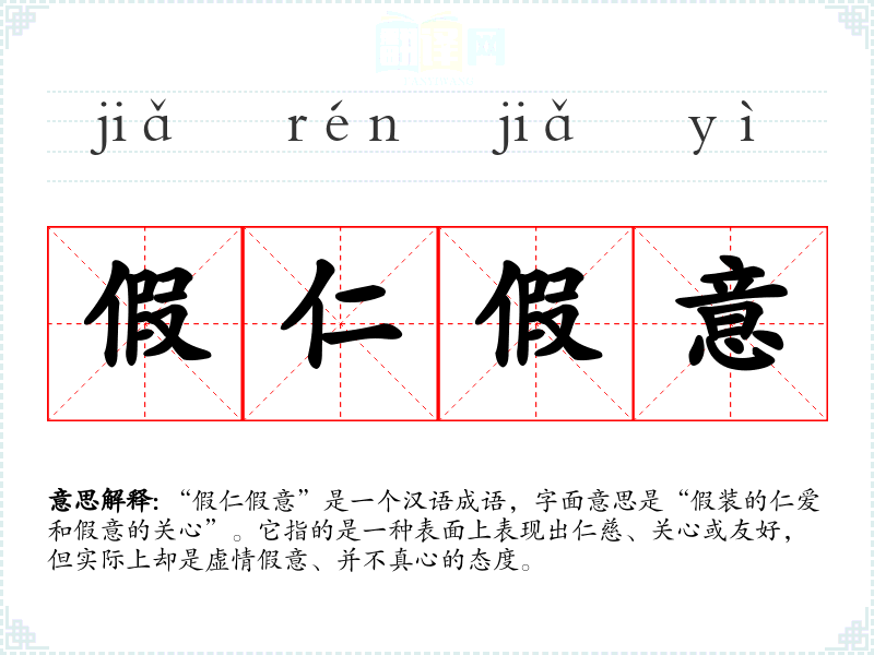 “假仁假意”是一个汉语成语,字面意思是“假装的仁爱和假意的关心”。它指的是一种表面上表现出仁慈、关心或友好,但实际上却是虚情假意、并不真心的态度。