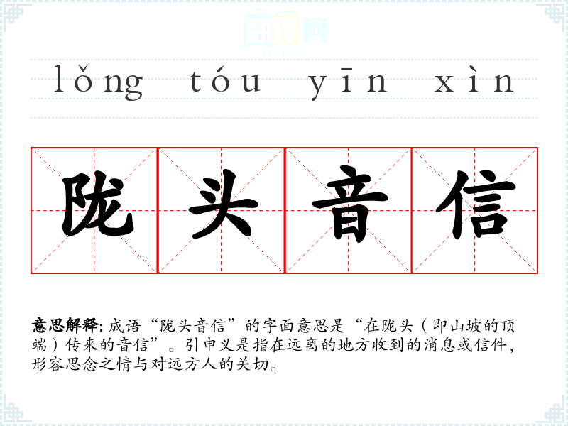 成语“陇头音信”的字面意思是“在陇头(即山坡的顶端)传来的音信”。引申义是指在远离的地方收到的消息或信件,形容思念之情与对远方人的关切。