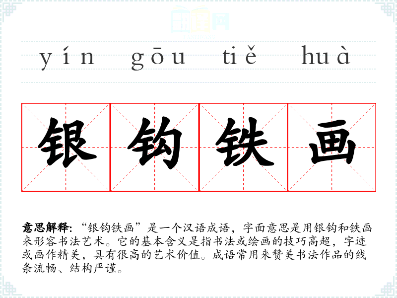 “银钩铁画”是一个汉语成语,字面意思是用银钩和铁画来形容书法艺术。它的基本含义是指书法或绘画的技巧高超,字迹或画作精美,具有很高的艺术价值。成语常用来赞美书法作品的线条流畅、结构严谨。