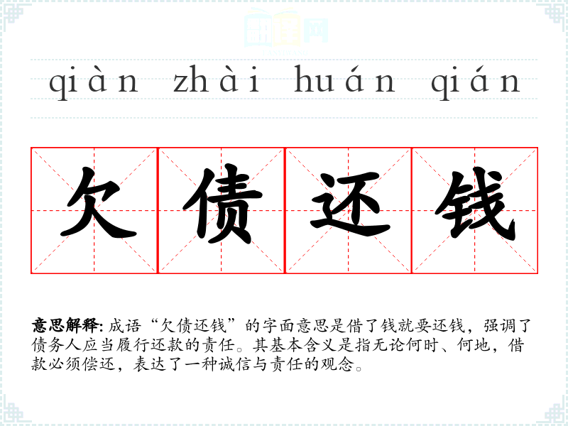 成语“欠债还钱”的字面意思是借了钱就要还钱,强调了债务人应当履行还款的责任。其基本含义是指无论何时、何地,借款必须偿还,表达了一种诚信与责任的观念。