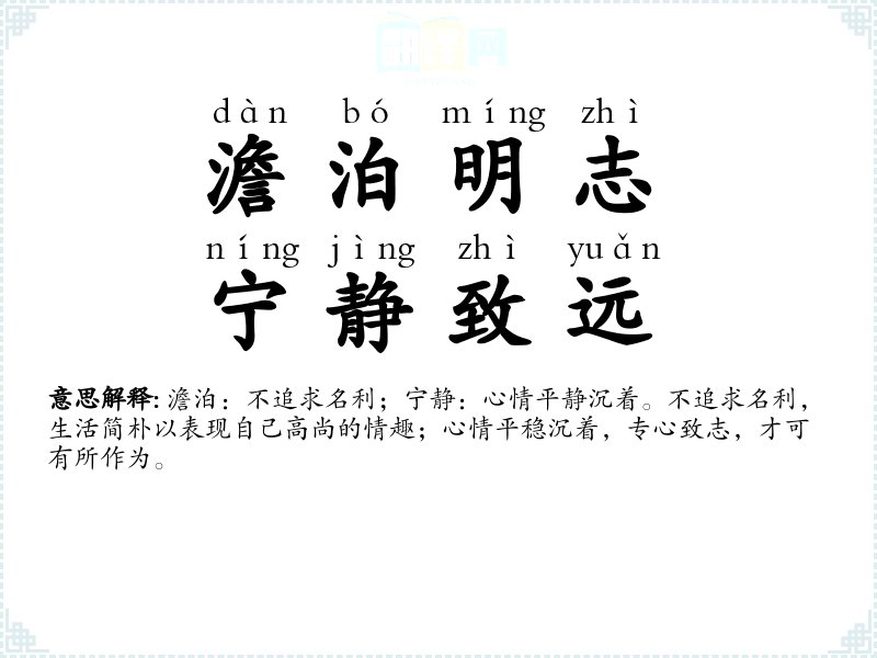 淡泊:恬淡寡欲;宁静:安宁恬静;致:达到。不追求名利,生活简朴以表现自己高尚的情趣;心情平稳沉着,才可有所作为。 |