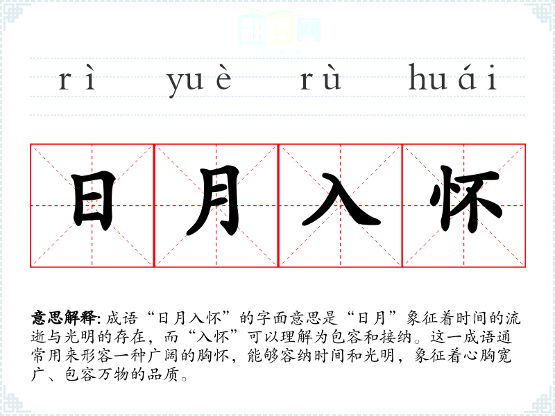 成语“日月入怀”的字面意思是“日月”象征着时间的流逝与光明的存在,而“入怀”可以理解为包容和接纳。这一成语通常用来形容一种广阔的胸怀,能够容纳时间和光明,象征着心胸宽广、包容万物的品质。
