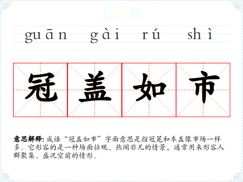 成语“冠盖如市”字面意思是指冠冕和车盖像市场一样多。它形容的是一种场面壮观、热闹非凡的情景,通常用来形容人群聚集、盛况空前的情形。