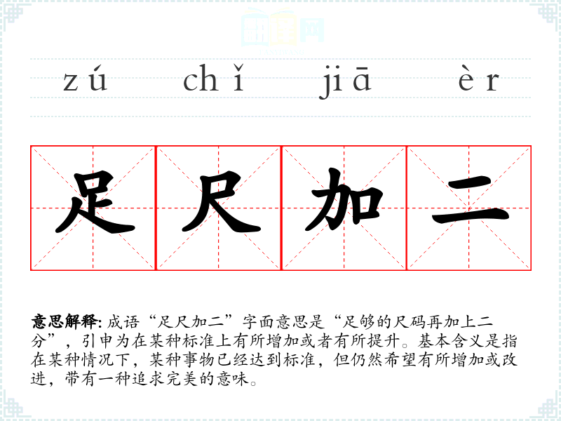 成语“足尺加二”字面意思是“足够的尺码再加上二分”,引申为在某种标准上有所增加或者有所提升。基本含义是指在某种情况下,某种事物已经达到标准,但仍然希望有所增加或改进,带有一种追求完美的意味。