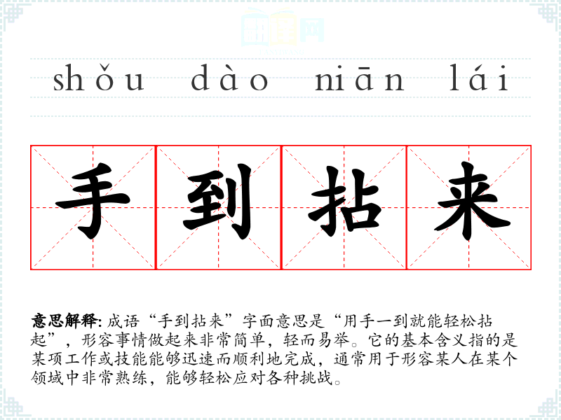 - 日常对话:朋友间聊天时,提到某人完成了一项困难的任务,大家可以说:“他真是手到拈来!”