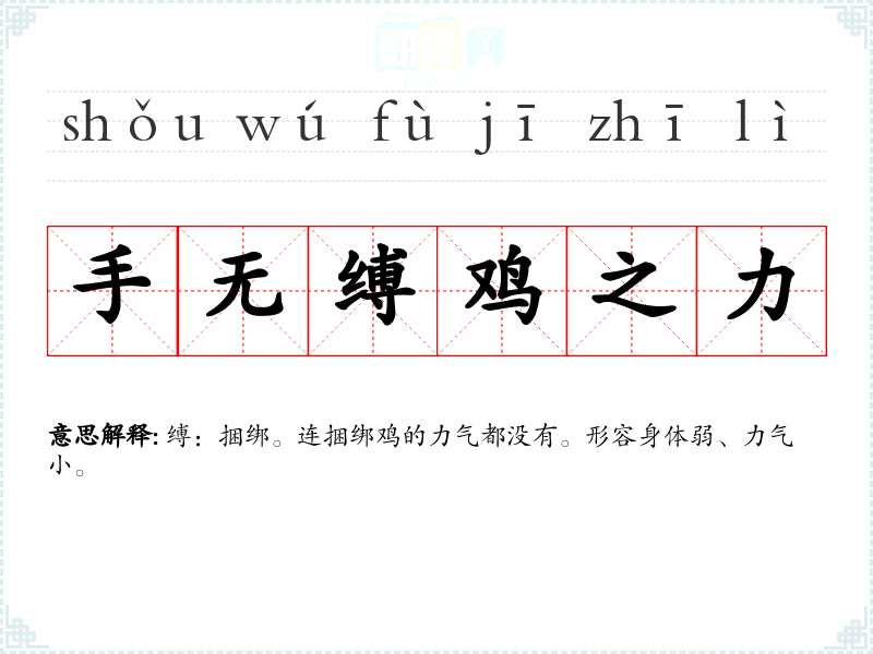 缚:捆绑。连捆绑鸡的力气都没有。形容身体弱、力气小。 |