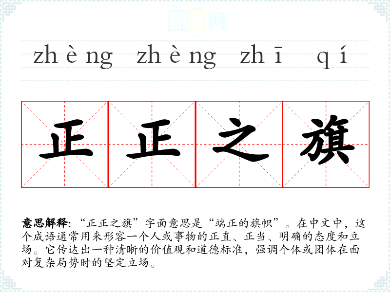 “正正之旗”字面意思是“端正的旗帜”。在中文中,这个成语通常用来形容一个人或事物的正直、正当、明确的态度和立场。它传达出一种清晰的价值观和道德标准,强调个体或团体在面对复杂局势时的坚定立场。