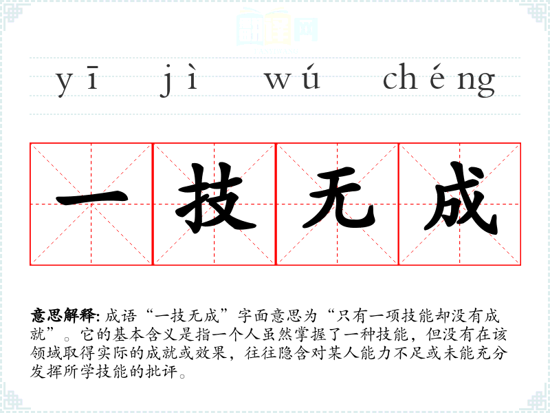 成语“一技无成”字面意思为“只有一项技能却没有成就”。它的基本含义是指一个人虽然掌握了一种技能,但没有在该领域取得实际的成就或效果,往往隐含对某人能力不足或未能充分发挥所学技能的批评。