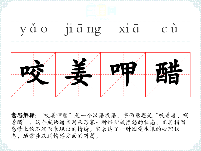 “咬姜呷醋”是一个汉语成语,字面意思是“咬着姜,喝着醋”。这个成语通常用来形容一种嫉妒或愤怒的状态,尤其指因感情上的不满而表现出的情绪。它表达了一种因爱生恨的心理状态,通常涉及到情感方面的纠葛。