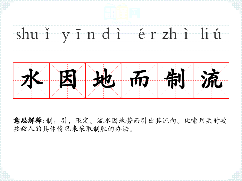 制:引,限定。流水因地势而引出其流向。比喻用兵时要按敌人的具体情况来采取制胜的办法。