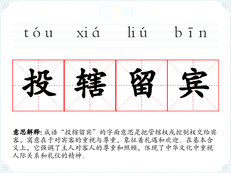 成语“投辖留宾”的字面意思是把管辖权或控制权交给宾客,寓意在于对宾客的重视与尊重,象征着礼遇和欢迎。在基本含义上,它强调了主人对客人的尊重和照顾,体现了中华文化中重视人际关系和礼仪的精神。