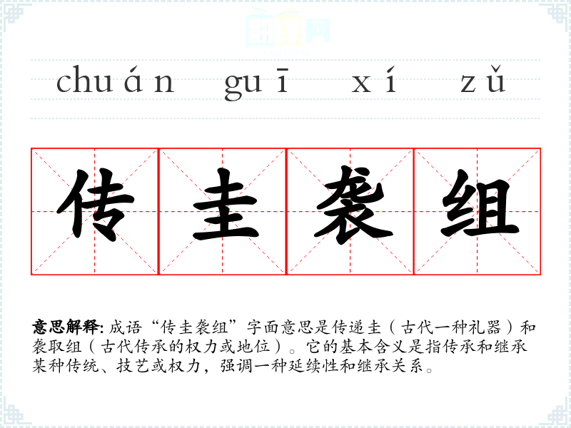 成语“传圭袭组”字面意思是传递圭(古代一种礼器)和袭取组(古代传承的权力或地位)。它的基本含义是指传承和继承某种传统、技艺或权力,强调一种延续性和继承关系。