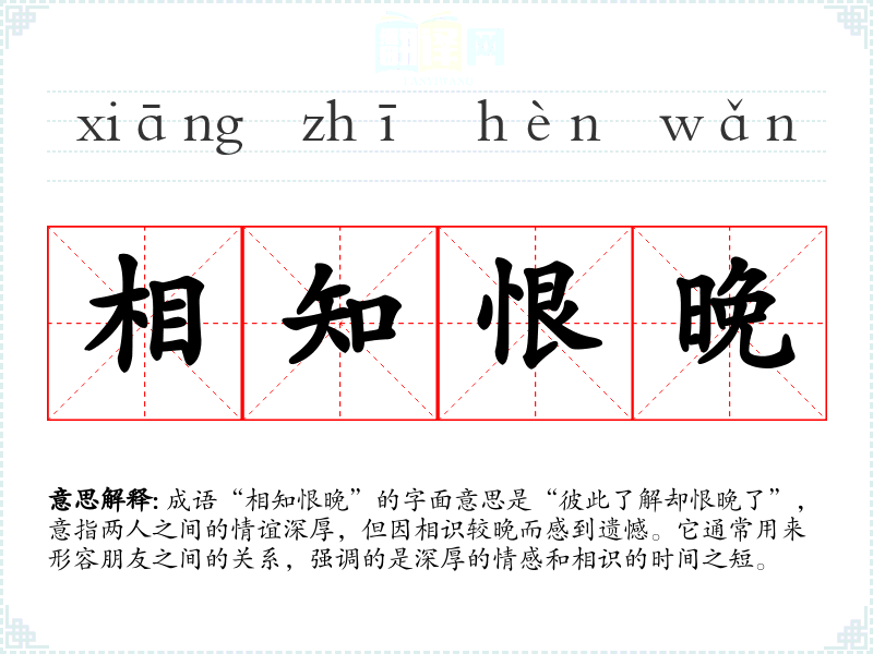 成语“相知恨晚”的字面意思是“彼此了解却恨晚了”,意指两人之间的情谊深厚,但因相识较晚而感到遗憾。它通常用来形容朋友之间的关系,强调的是深厚的情感和相识的时间之短。