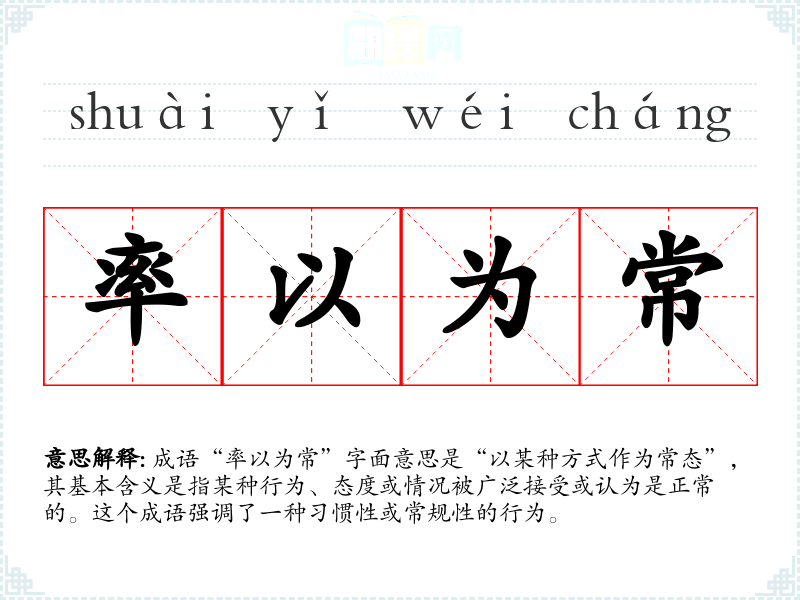 成语“率以为常”字面意思是“以某种方式作为常态”,其基本含义是指某种行为、态度或情况被广泛接受或认为是正常的。这个成语强调了一种习惯性或常规性的行为。
