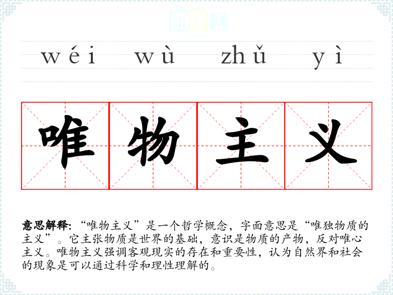 “唯物主义”是一个哲学概念,字面意思是“唯独物质的主义”。它主张物质是世界的基础,意识是物质的产物,反对唯心主义。唯物主义强调客观现实的存在和重要性,认为自然界和社会的现象是可以通过科学和理性理解的。