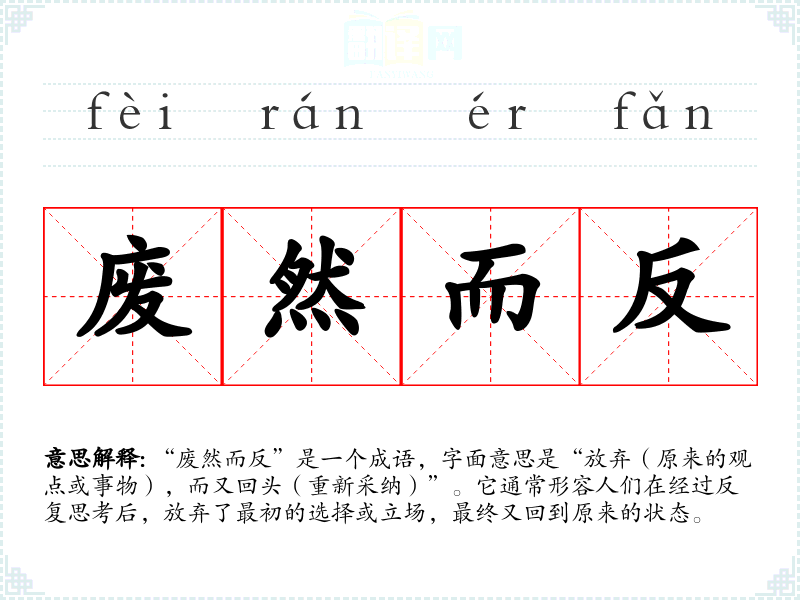 “废然而反”是一个成语,字面意思是“放弃(原来的观点或事物),而又回头(重新采纳)”。它通常形容人们在经过反复思考后,放弃了最初的选择或立场,最终又回到原来的状态。