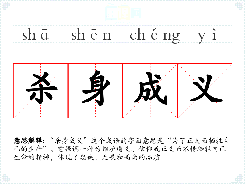 “杀身成义”这个成语的字面意思是“为了正义而牺牲自己的生命”。它强调一种为维护道义、信仰或正义而不惜牺牲自己生命的精神,体现了忠诚、无畏和高尚的品质。