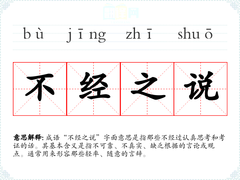 成语“不经之说”字面意思是指那些不经过认真思考和考证的话。其基本含义是指不可靠、不真实、缺乏根据的言论或观点。通常用来形容那些轻率、随意的言辞。