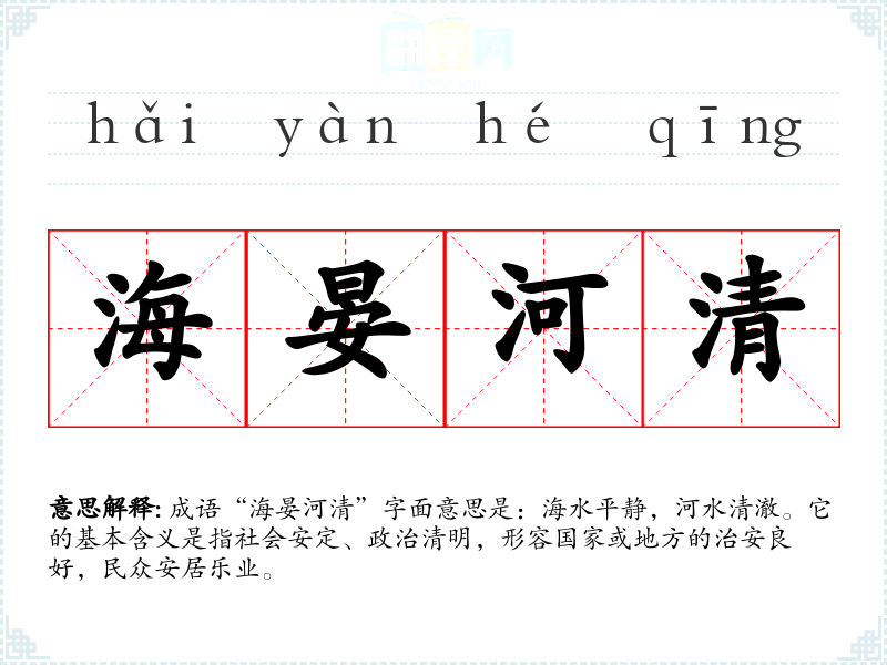 成语“海晏河清”字面意思是:海水平静,河水清澈。它的基本含义是指社会安定、政治清明,形容国家或地方的治安良好,民众安居乐业。
