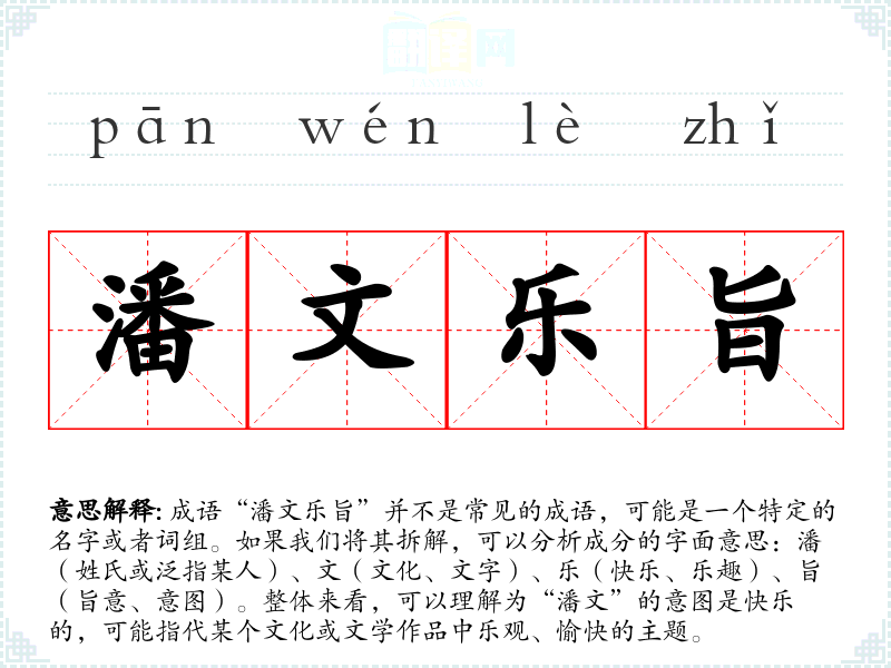 由于“潘文乐旨”并没有明确的历史背景或典故,它可能来源于某个具体的文学作品或现代语境中。若是从“潘”和“文”联想,可以推测其可能与某位名为潘的人物或与文化相关的内容有关。