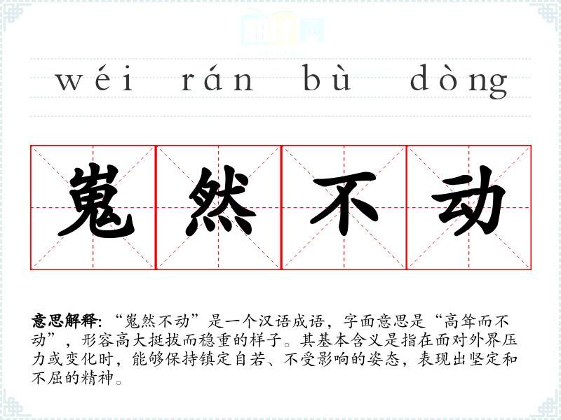 “嵬然不动”是一个汉语成语,字面意思是“高耸而不动”,形容高大挺拔而稳重的样子。其基本含义是指在面对外界压力或变化时,能够保持镇定自若、不受影响的姿态,表现出坚定和不屈的精神。