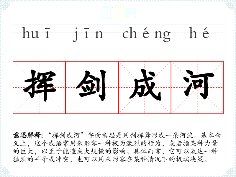 “挥剑成河”这个成语的具体历史来源并不明确,可能与古代的战斗和英雄主义相关。在**古代文学中,剑象征着力量和勇气,而“成河”的概念则强调了冲突或力量的广泛影响。这个成语可能是对历史或文学作品中激烈战斗场景的形象化描绘。