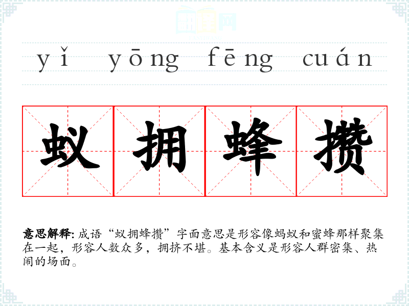 成语“蚁拥蜂攒”字面意思是形容像蚂蚁和蜜蜂那样聚集在一起,形容人数众多,拥挤不堪。基本含义是形容人群密集、热闹的场面。