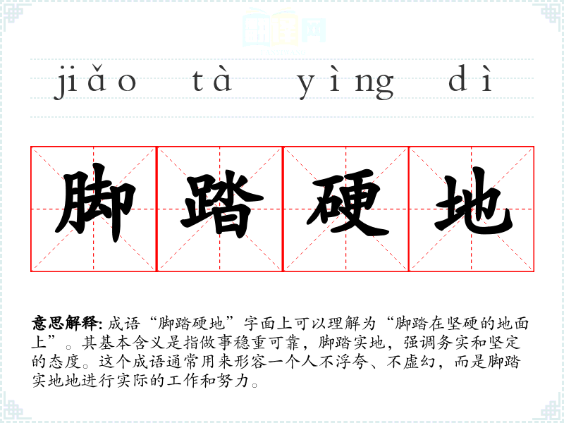 - 脚踏实地:强调做事要稳重、实在,和“脚踏硬地”意思相近。