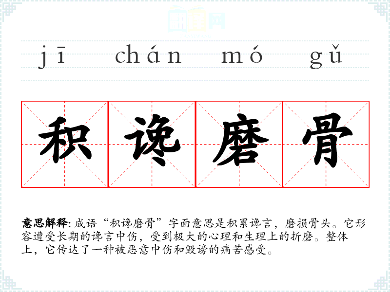 在英语中,类似的表达是“backstabbing”,意指在背后捅刀,与“积谗磨骨”有相似的含义。然而,“backstabbing”更多地侧重于行为,而“积谗磨骨”则强调了所产生的精神上和情感上的痛苦。