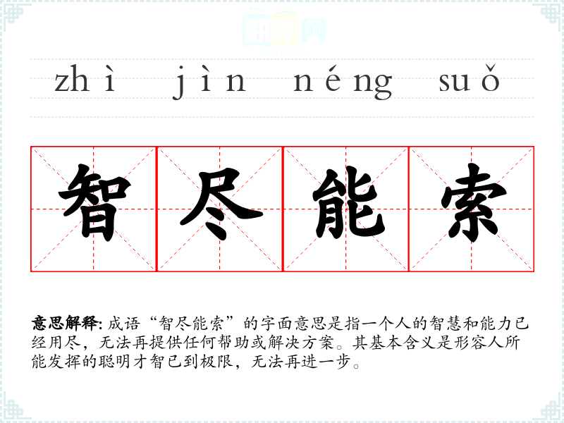 成语“智尽能索”的字面意思是指一个人的智慧和能力已经用尽,无法再提供任何帮助或解决方案。其基本含义是形容人所能发挥的聪明才智已到极限,无法再进一步。