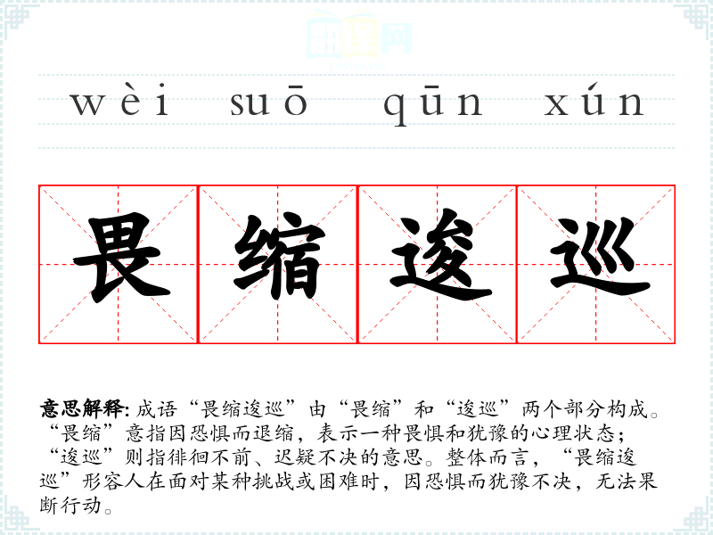 成语“畏缩逡巡”由“畏缩”和“逡巡”两个部分构成。“畏缩”意指因恐惧而退缩,表示一种畏惧和犹豫的心理状态;“逡巡”则指徘徊不前、迟疑不决的意思。整体而言,“畏缩逡巡”形容人在面对某种挑战或困难时,因恐惧而犹豫不决,无法果断行动。