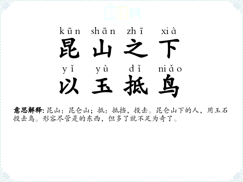 昆山:昆仑山;抵:抵挡,投击。昆仑山下的人,用玉石投击鸟。形容尽管是的东西,但多了就不足为奇了。 |