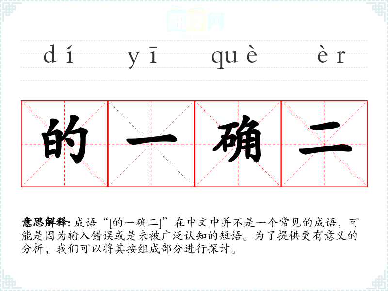 成语常常由四个字组成,而“[的一确二]”似乎是一个不完整的表达。如果我们考虑“确”和“二”可能与“确实”和“第二”的含义,字面上可以理解为“第一是确实的,第二是...”。这暗示了在某种情况下的权重或优先级。