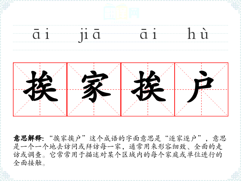 “挨家挨户”这个成语的字面意思是“逐家逐户”,意思是一个一个地去访问或拜访每一家,通常用来形容细致、全面的走访或调查。它常常用于描述对某个区域内的每个家庭或单位进行的全面接触。