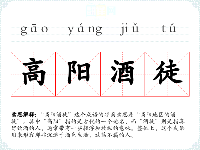 “高阳酒徒”这个成语的字面意思是“高阳地区的酒徒”。其中“高阳”指的是古代的一个地名,而“酒徒”则是指喜好饮酒的人,通常带有一些轻浮和放纵的意味。整体上,这个成语用来形容那些沉迷于酒色生活、放荡不羁的人。