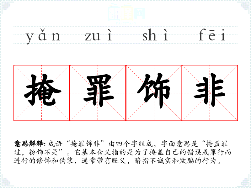 成语“掩罪饰非”由四个字组成,字面意思是“掩盖罪过,粉饰不是”。它基本含义指的是为了掩盖自己的错误或罪行而进行的修饰和伪装,通常带有贬义,暗指不诚实和欺骗的行为。