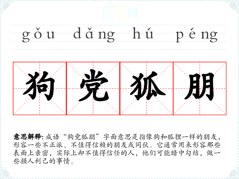 - 反义成语:志同道合、肝胆相照。相比之下,这些成语强调了朋友之间的真诚与信任,正好与“狗党狐朋”的负面含义相对。