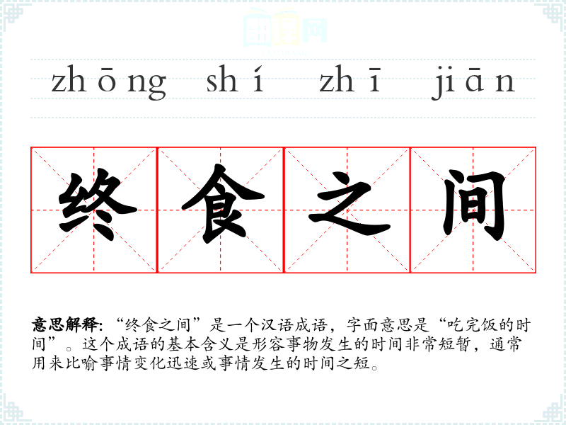 “终食之间”是一个汉语成语,字面意思是“吃完饭的时间”。这个成语的基本含义是形容事物发生的时间非常短暂,通常用来比喻事情变化迅速或事情发生的时间之短。
