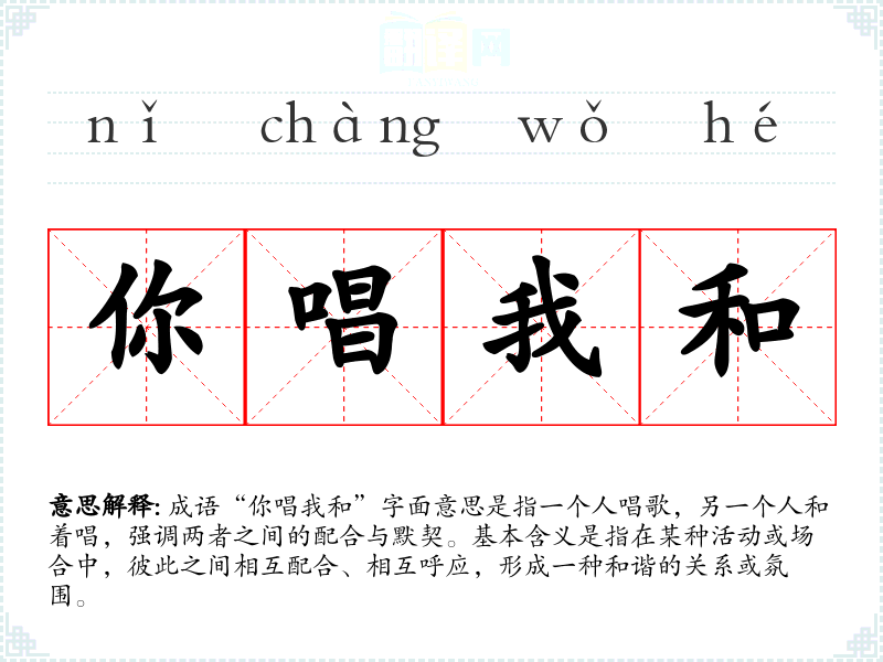 成语“你唱我和”字面意思是指一个人唱歌,另一个人和着唱,强调两者之间的配合与默契。基本含义是指在某种活动或场合中,彼此之间相互配合、相互呼应,形成一种和谐的关系或氛围。